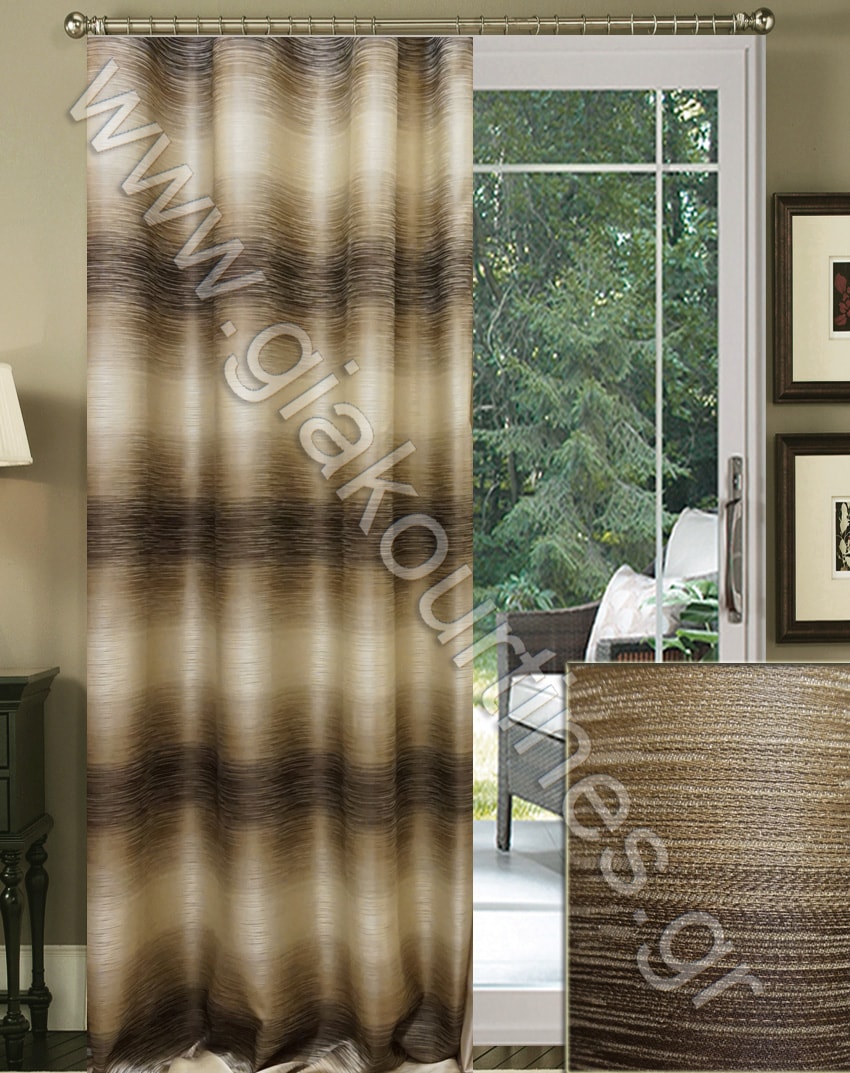 Ριντό αδιάφανο ραμμένο, ταφτάς πολυτελείας με σατινέ απαλή υφή. Είναι χυτό ύφασμα με ρίγες. Το χρώμα της κουρτίνας είναι μπεζ, μόκα και αποχρώσεις του καφέ. Μπορεί να χρησιμοποιηθεί μόνη της, ως κουρτίνα σκίασης ή σε συνδυασμό με κάποια πιο λεπτή, ως ριντό ή ως ρόμαν πακέτο.