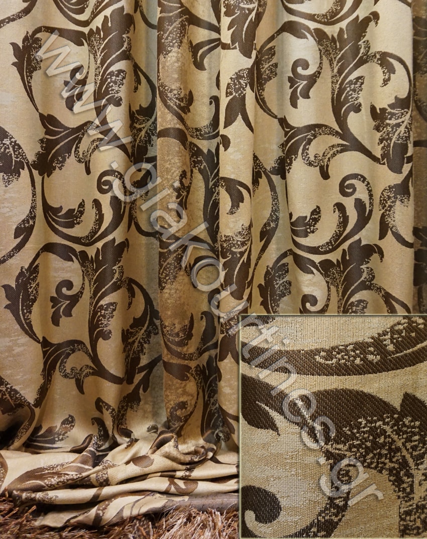 αδιάφανο πολυτελείας, μπαρόκ, εξαιρετικά χυτό και μαλακό. Το χρώμα της κουρτίνας είναι μπεζ με μπαρόκ χρώμα καφέ.