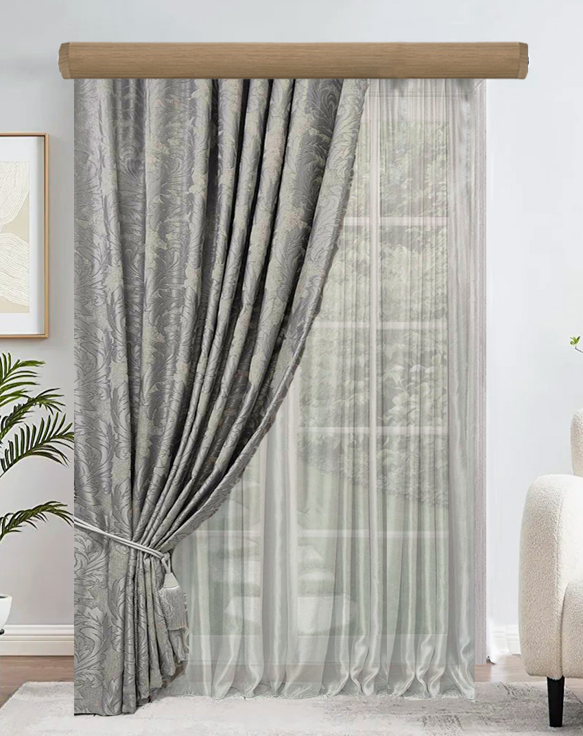 Κουρτίνα σκίασης έτοιμη ραμμένη. Ύφασμα ζακάρ πολυτελείας, χωρίς διαφάνεια, Ευρωπαίκών προτύπων και ποιότητας. Είναι χυτό ύφασμα, με μπαρόκ μοτίβο κλαδί. Το χρώμα της κουρτίνας είναι απαλό γκρι με μοτίβο κλαδί απαλό γκρι.