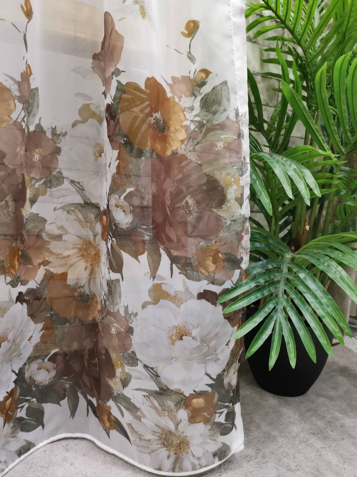 Κουρτίνα, με διαφάνεια, έτοιμη ραμμένη. Χυτό ύφασμα, Ευρωπαίκών προτύπων και ποιότητας. Γαλλικό βουάλ με λευκή βάση και floral μοτίβο σε αποχρώσεις του καφέ.