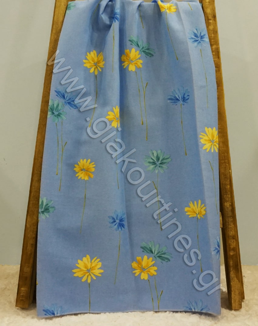 Ύφασμα αδιάφανο, ποιότητα λονέτα. Το χρώμα του είναι γαλάζιο με μπλε, κίτρινα και aqua λουλούδια.