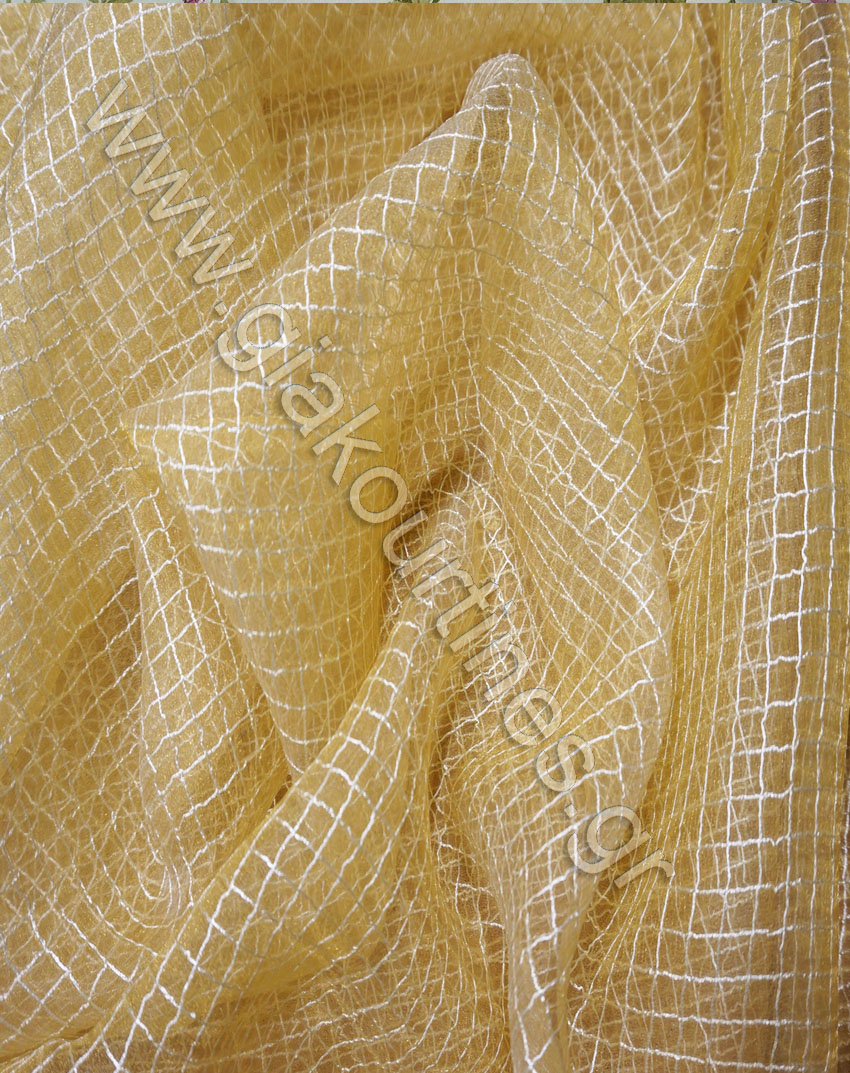 Ύφασμα διάφανη οργάντζα, ατσαλάκωτο με βαρίδι στο τελείωμα. Το χρώμα της είναι μελί χρυσαφί.