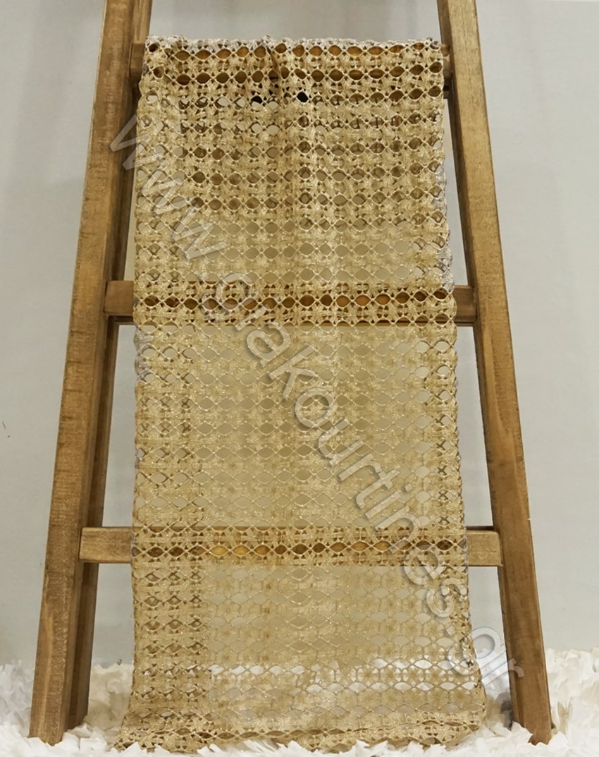 ΡΚουρτίνα βαρύ δίχτυ κιπούρ, εξαιρετικής ποιότητας, με κλωστή glitter. Το χρώμα της κουρτίνας ειναι μπεζοχρυσαφί. Μπορεί να χρησιμοποιηθεί ως κουρτίνα και ως ριντό πάνω από άλλη.