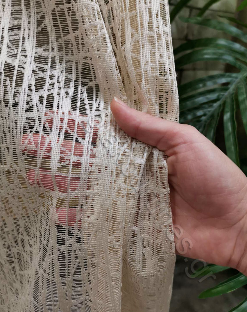 Ύφασμα για κουρτίνα, δαντέλα, με διαφάνεια, Ευρωπαϊκών προδιαγραφών. Μοντέρνα δαντέλα, ανάλαφρη, σταθερή κουρτίνα, με φιστόνι στο τελείωμα. Ατσαλάκωτο, χυτό και σταθερό ύφασμα. Το χρώμα της κουρτίνας είναι γλυκό μπεζ. Ατσαλάκωτο ύφασμα, δεν χρειάζεται καθόλου σίδερο.