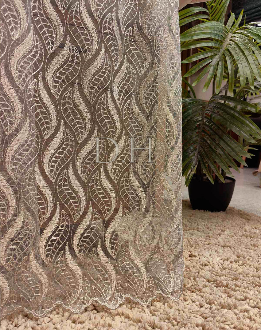 Ύφασμα για κουρτίνα με το μέτρο, με διαφάνεια, Ευρωπαϊκών προδιαγραφών. Πολυτελείας τούλινη οργαντίνα κεντημένη, με εξαιρετικά νήματα, κλωστή glitter και φιστόνι στο τελείωμα. Το χρώμα της κουρτίνας είναι ουδέτερο με κεντημένα χρώμα μπεζοχρυσαφί. Ατσαλάκωτο ύφασμα, δεν χρειάζεται καθόλου σίδερο.
