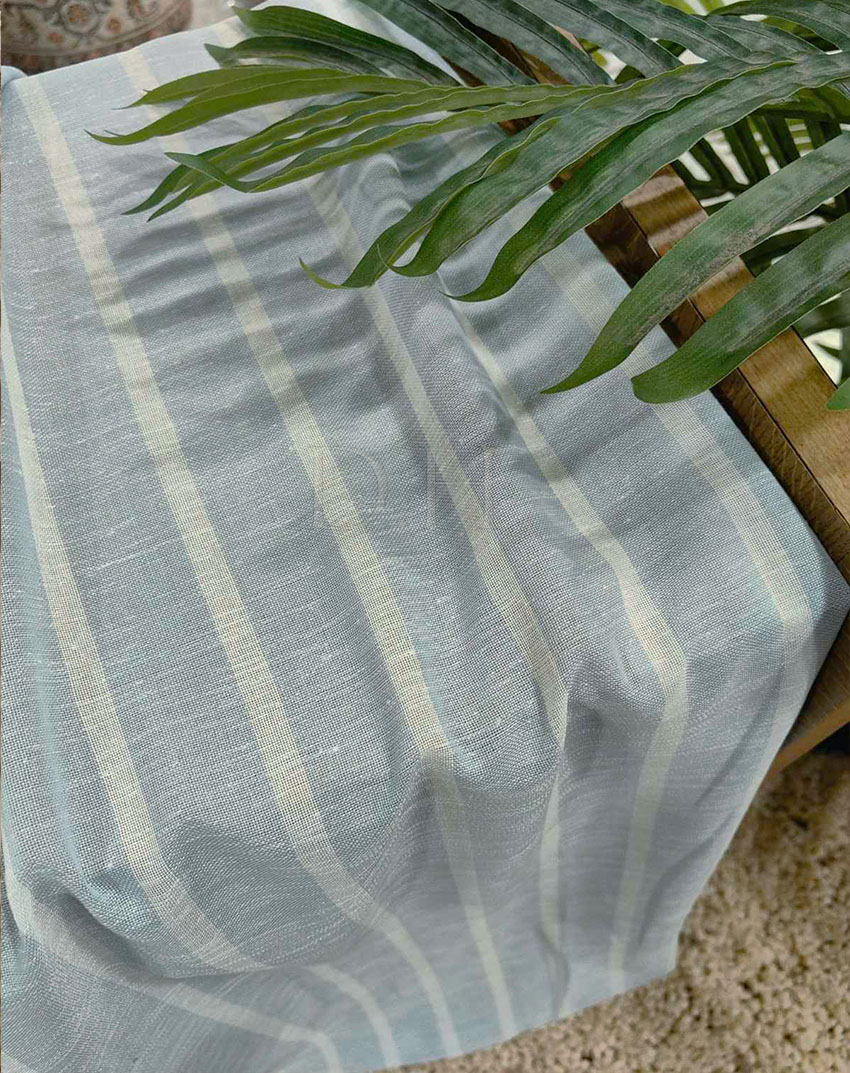 Ύφασμα για κουρτίνα , ημιδιάφανη, Ευρωπαϊκών προδιαγραφών. Γάζα σταθερή, διαθέτει ενσωματωμένο βαρίδι στο τελείωμα για σωστό λούκι και στήσιμο της κουρτίνας. Η κουρτίνα έχει χρώμα γαλάζιο με ρίγες λευκές