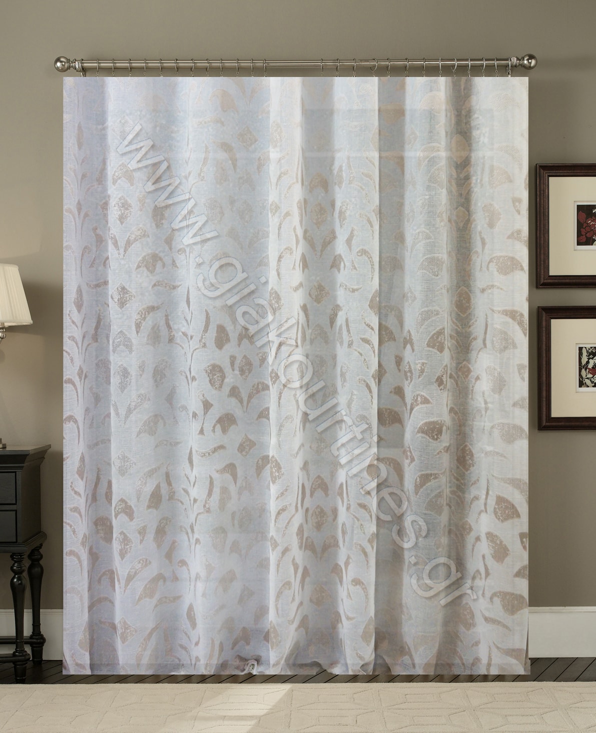 Κουρτίνα τύπου λινό πολυέστερ με ματ υφή, ημιδιάφανη. Μοντέρνο ύφασμα ατσαλάκωτο, με σχέδιο φιλ κουπέ φύλλα. Το χρώμα της κουρτίνας είναι λευκό με μπεζ. Μπορεί να χρησιμοποιηθεί ως κουρτίνα μόνη της ή σε συνδυασμό με κάποια πιο χοντρή, ριντό.Είναι ραμμένη στο εργαστήριο μας με ελληνική τρέσσα συνεχόμενη, 8 εκατοστών.
