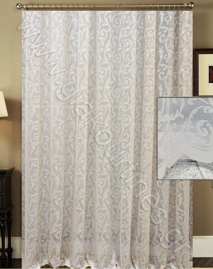 Κουρτίνα μπαρόκ διάφανη. Είναι χυτό και ανάλαφρο ύφασμα με σχέδια μπαρόκ και φιστόνι στο τελείωμα. Το χρώμα της κουρτίνας είναι υπόλευκο. Η κουρτίνα αυτή δεν χρειάζεται σίδερο. Μπορεί να χρησιμοποιηθεί ως κουρτίνα μόνη της ή σε συνδυασμό με κάποια πιο χοντρή, ριντό. Είναι ραμμένη στο εργαστήριο μας με ελληνική τρέσσα συνεχόμενη, 8 εκατοστών.