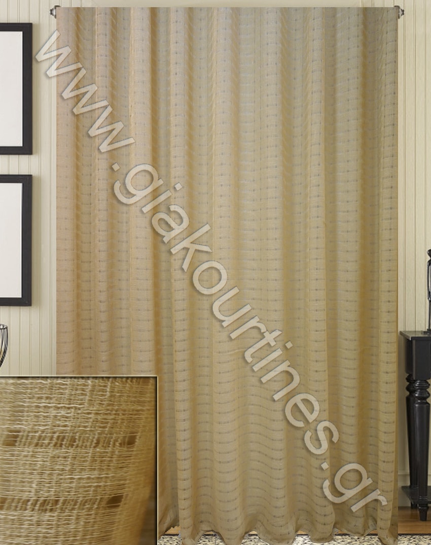 Κουρτίνα διάφανη έτοιμη ραμμένη, διχτάκι τύπου λινό. Είναι χυτό ύφασμα με βαρίδι στο τελείωμα. Το χρώμα της είναι μπεζοσπαγγί. Είναι κουρτίνα που δεν χρειάζεται ιδιαίτερο σίδερο.
