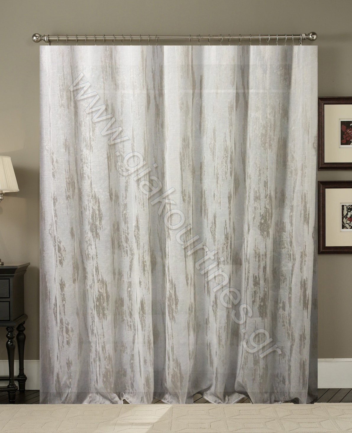 Κουρτίνα τύπου λινό πολυέστερ με ματ υφή, ημιδιάφανη. Μοντέρνο ύφασμα ατσαλάκωτο, με σχέδιο φιλ κουπέ βροχή. Το χρώμα της κουρτίνας είναι υπόλευκο με γκρί. Μπορεί να χρησιμοποιηθεί ως κουρτίνα μόνη της ή σε συνδυασμό με κάποια πιο χοντρή, ριντό.Είναι ραμμένη στο εργαστήριο μας με ελληνική τρέσσα συνεχόμενη, 8 εκατοστών.