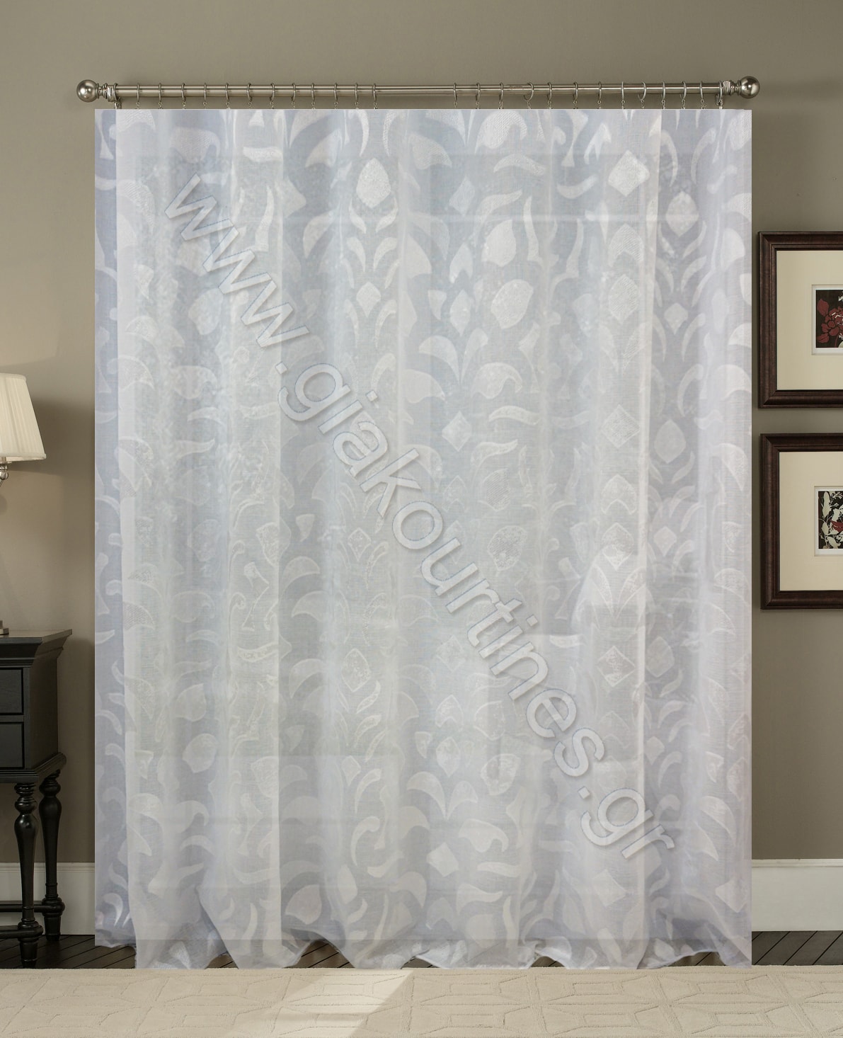 Κουρτίνα τύπου λινό πολυέστερ με ματ υφή, ημιδιάφανη. Μοντέρνο ύφασμα ατσαλάκωτο, με σχέδιο φιλ κουπέ φύλλα. Το χρώμα της κουρτίνας είναι λευκό. Μπορεί να χρησιμοποιηθεί ως κουρτίνα μόνη της ή σε συνδυασμό με κάποια πιο χοντρή, ριντό.Είναι ραμμένη στο εργαστήριο μας με ελληνική τρέσσα συνεχόμενη, 8 εκατοστών.