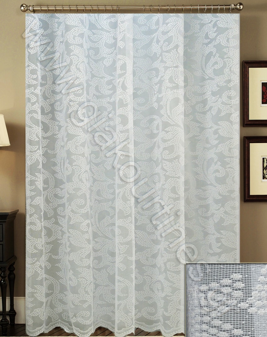 Κουρτίνα δαντέλα διάφανη. Είναι χυτό και σταθερό ύφασμα με μοντέρνο σχέδιο και φιστόνι στο τελείωμα. Διατίθεται σε κατάλευκο και υπόλευκο. Η κουρτίνα αυτή δεν χρειάζεται σίδερο. Μπορεί να χρησιμοποιηθεί ως κουρτίνα μόνη της ή σε συνδυασμό με κάποια πιο χοντρή, ριντό. Είναι ραμμένη στο εργαστήριο μας με ελληνική τρέσσα συνεχόμενη, 8 εκατοστών.