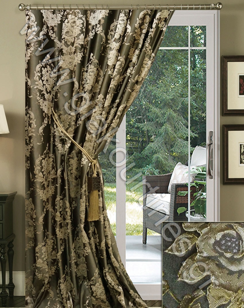 Ριντό αδιάφανο, ταφτάς σατινέ, πολυτελείας ανάγλυφος. Είναι χυτό ύφασμα, με μπαρόκ σχέδια τριαντάφυλλα χρυσολαδί και κλωστή glitter στο κέντρο τους. Το χρώμα της κουρτίνας είναι σκούρο καφέ.