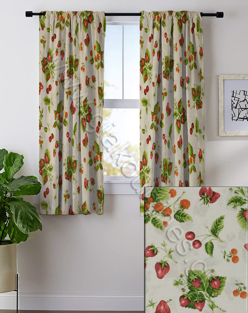 Κουρτινάκι για παράθυρο, έτοιμο ραμμένο. Αποτελείται από 2 τεμάχια. Αδιάφανη λονέτα Ισπανίας σε χρώμα εκρού, με μοτίβα φράουλες και κερασάκια. Ράβονται στο εργαστήριο μας με ελληνική ποιοτική τρέσα. Οι διαστάσεις μπορούν να τροποποιηθούν. Συνδυάστε με κουρτίνα μπαλκονόπορτας ΚΕΡ74 ή υπόλευκη κουρτίνα διάφανη. Διατίθεται και σε τραβέρσα (runner) για τραπέζι.
