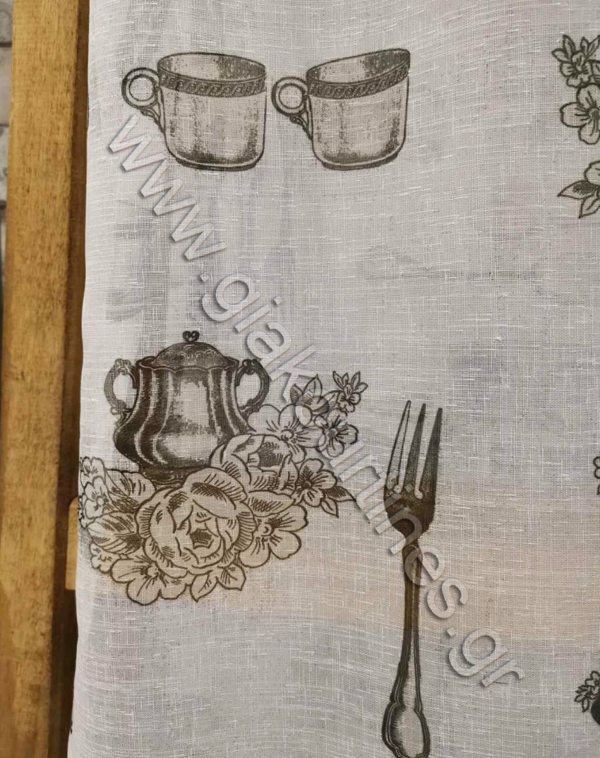Ύφασμα για κουρτίνα , ημιδιάφανη, Ευρωπαϊκών προδιαγραφών. Γάζα σταθερή, χρώμα σπασμένο ζαχαρί με κουζινικά χρώμα απαλό ανθρακί. Διαθέτει ενσωματωμένο βαρίδι στο τελείωμα για σωστό λούκι και στήσιμο της κουρτίνας.