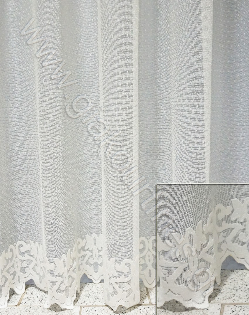 Κουρτίνα πολυτελείας, φριζαριζέ πολυέστερ διάφανη. Είναι χυτό ύφασμα και ατσαλάκωτο με βαρύ φιστόνι στο τελείωμα. Το χρώμα της κουρτίνας είναι υπόλευκο. Μπορεί να χρησιμοποιηθεί ως κουρτίνα μόνη της ή σε συνδυασμό με κάποια πιο χοντρή, ριντό.