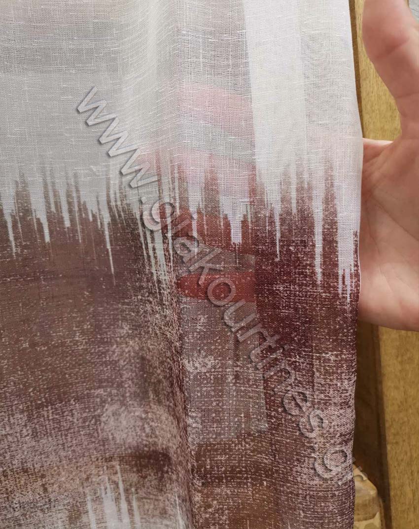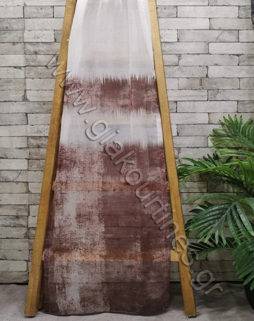 Ύφασμα για κουρτίνα , ημιδιάφανη, Ευρωπαϊκών προδιαγραφών. Ατσαλάκωτη γάζα σταθερή σε αποχρώσεις του λευκού και καφέ. Το μοτίβο της κουρτίνας φτάνει τα 1,20 μέτρα και συνεχίζει με μονόχρωμο λευκό στο πάνω μέρος. Διαθέτει ενσωματομένο βαρίδι στο τελείωμα για σωστό λούκι και στήσιμο της κουρτίνας.