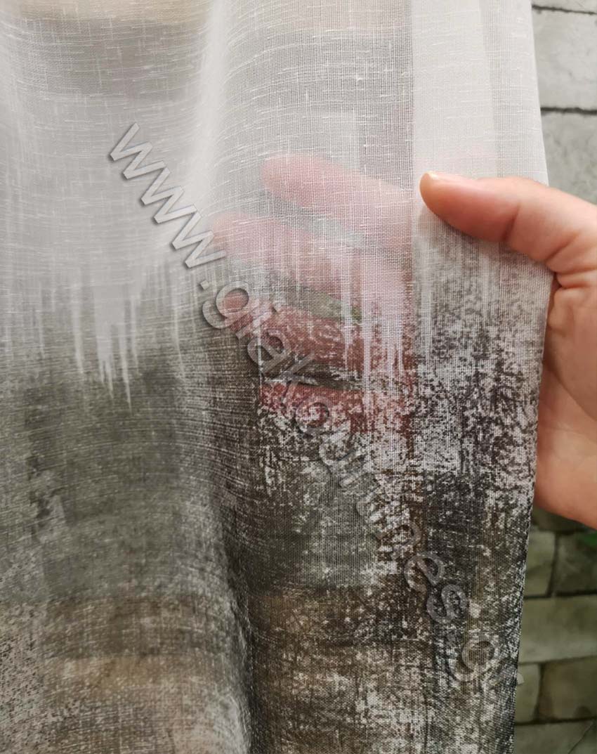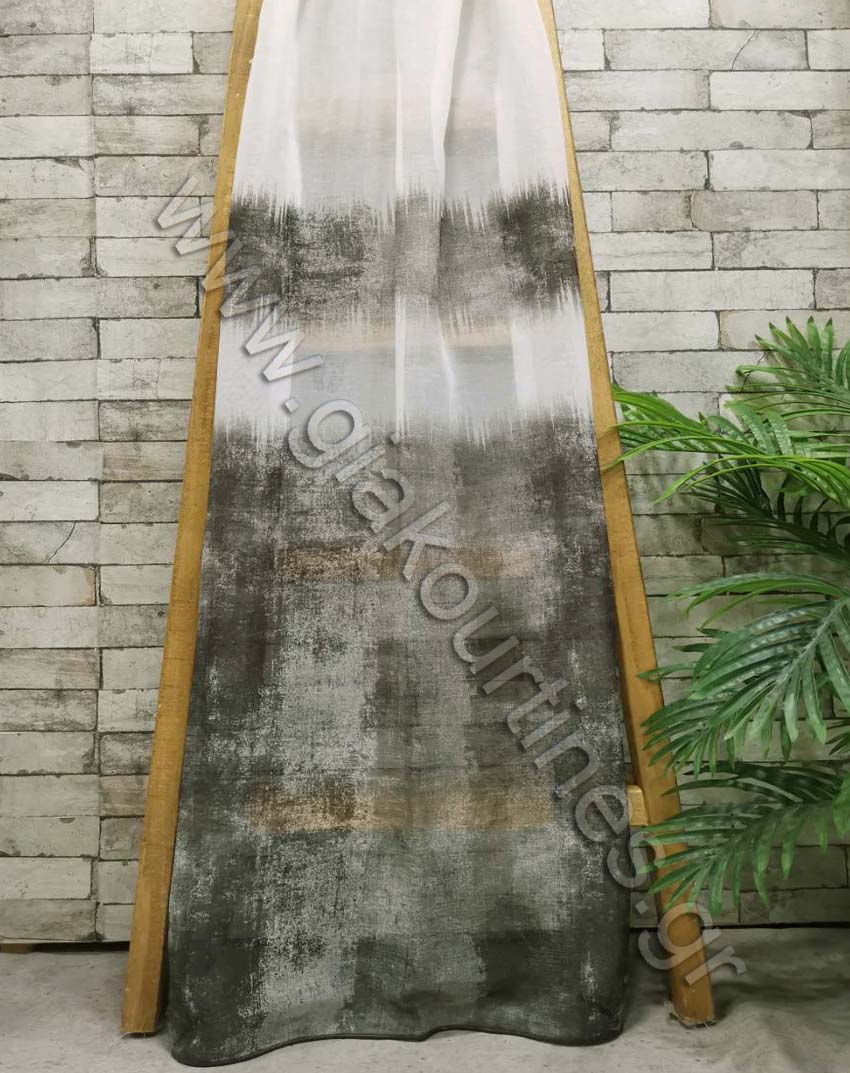 Ύφασμα για κουρτίνα, ημιδιάφανη, Ευρωπαϊκών προδιαγραφών. Ατσαλάκωτη γάζα σταθερή σε αποχρώσεις του λευκού και γκρι μολυβί. Το μοτίβο της κουρτίνας φτάνει τα 1,20 μέτρα και συνεχίζει με μονόχρωμο λευκό στο πάνω μέρος. Διαθέτει ενσωματομένο βαρίδι στο τελείωμα για σωστό λούκι και στήσιμο της κουρτίνας.