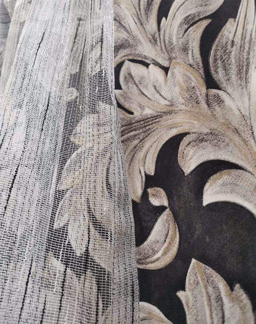 Κουρτίνα σκίασης έτοιμη ραμμένη. Ύφασμα λονέτα Ισπανίας, , χωρίς διαφάνεια, Ευρωπαίκών προτύπων και ποιότητας. Το χρώμα της κουρτίνας είναι ανθρακί, με vintage μπαρόκ μοτίβο.
