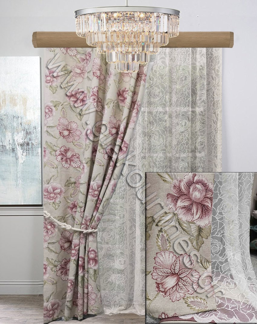 Κουρτίνα σκίασης έτοιμη ραμμένη. Ύφασμα λονέτα Ισπανίας, , χωρίς διαφάνεια, Ευρωπαίκών προτύπων και ποιότητας. Το χρώμα της κουρτίνας είναι μπεζ άμμου με floral dusty pink.