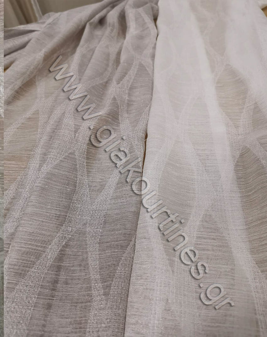 Ύφασμα για κουρτίνα , μέτριας διαφάνειας, Ευρωπαϊκών προδιαγραφών. Κουρτίνα χυτή, με φιλ κουπέ σχέδιο μέσα στην ύφανση. Διαθέσιμο σε λευκό και γκρεζ. Διαθέτει βαρίδι στο τελείωμα.