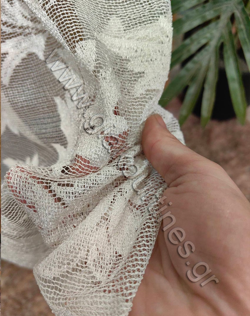 Ύφασμα για κουρτίνα , με διαφάνεια, Ευρωπαϊκών προδιαγραφών. Δαντέλα σταθερή με φιστόνι στο τελείωμα. Ατσαλάκωτο, χυτό και σταθερό ύφασμα, υφασμένο με φλος νήματα εξαιρετικής ποιότητας. Το χρώμα της κουρτίνας είναι υπόλευκο. Ατσαλάκωτο ύφασμα, δεν χρειάζεται καθόλου σίδερο.