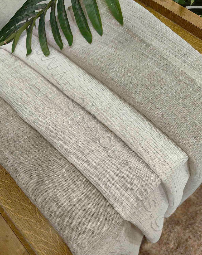 Ύφασμα για κουρτίνα , ημιδιάφανη, Ευρωπαϊκών προδιαγραφών. Γάζα σταθερή με ρίγες υπόλευκο και απαλό γκρεζ. Διαθέτει ενσωματωμένο βαρίδι στο τελείωμα για σωστό λούκι και στήσιμο της κουρτίνας.
