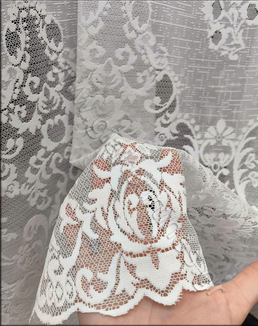 , μοντέρνα δαντέλα ανάλαφρη. Έχει επιβλητικό φιστόνι στο τελείωμα και το χρώμα της είναι υπόλευκο