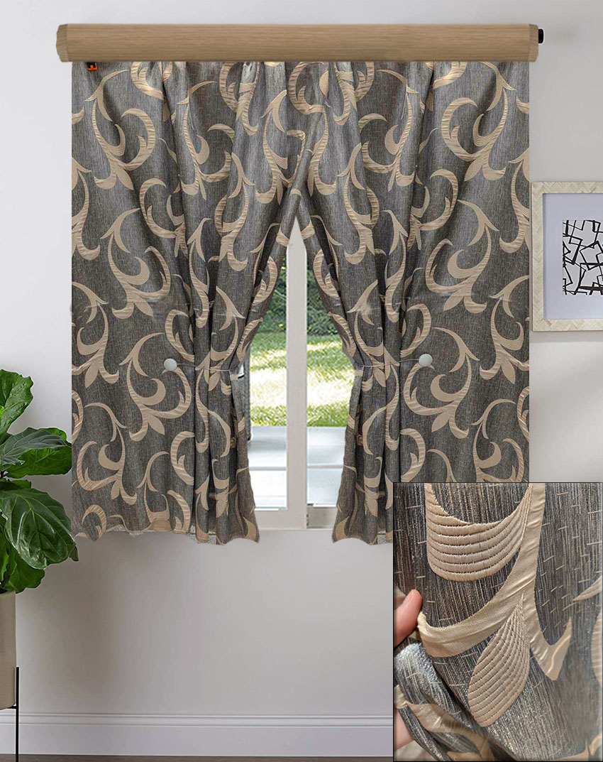 Κουρτίνα κοντή για παράθυρο. Είναι κουρτίνα σκίασης, χωρίς ορατότητα. Το ύφασμα είναι ταφτάς, χρώμα γκρι με μπεζ μοτίβο κλαδί. Οι κουρτίνες είναι ραμμένες με ελληνική τρέσα αντοχής ,6 εκ. συνεχομένη πιέτα.