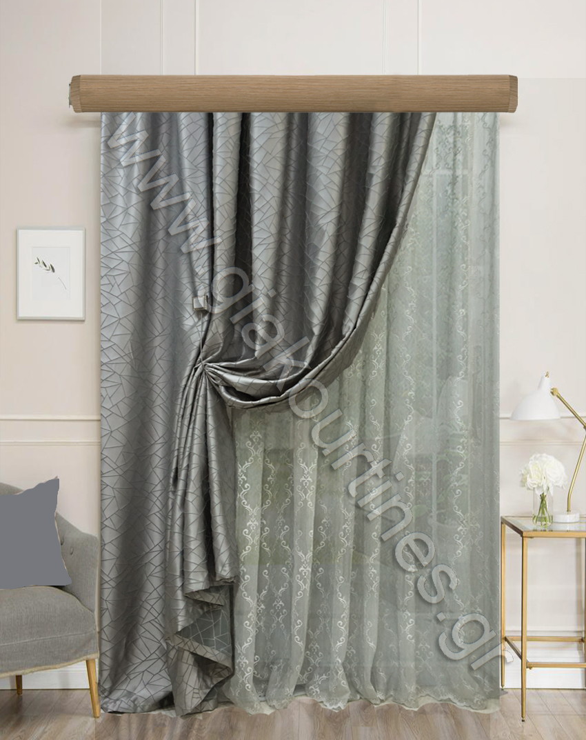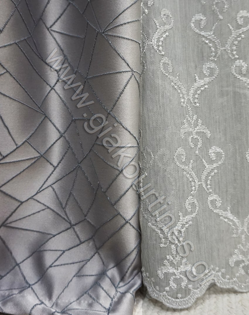 Εσωτερική κουρτίνα πολυτελείας, με διαφάνεια, εξαιρετικά χυτή, με φιστόνι στο τελείωμα. Σταθερή κουρτίνα με ματ υφή και πυκνοδουλεμένο κέντημα με κλωστή glitter. To χρώμα της κουρτίνας είναι γκρι ανοιχτό.