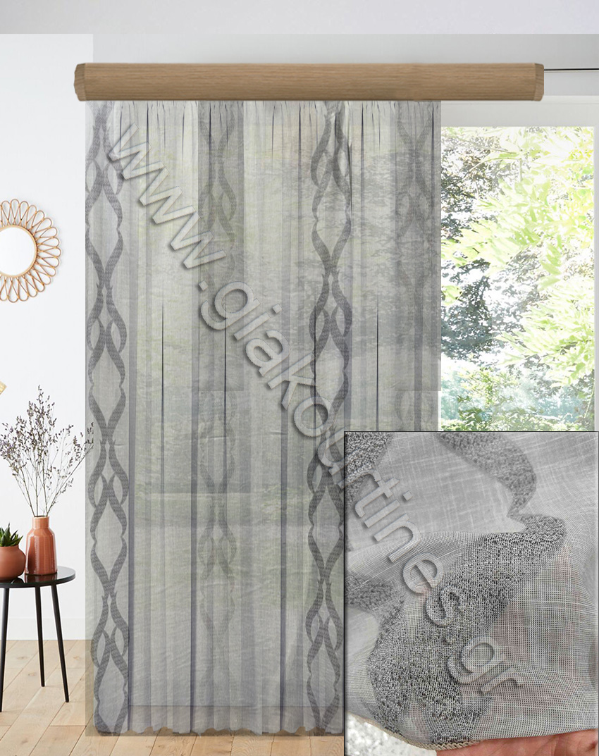 Κουρτίνα, με μερική διαφάνεια, έτοιμη ραμμένη. Χυτό ύφασμα, Ευρωπαίκών προτύπων και ποιότητας. Γάζα τύπου λινό γκριζοσιέλ με γκρι απαλό και γκρι μοτίβο.