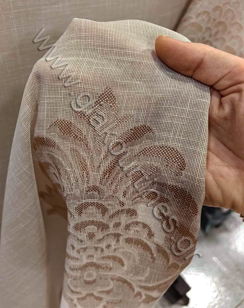 Κουρτίνα, με μερική διαφάνεια, έτοιμη ραμμένη. Χυτό ύφασμα, Ευρωπαίκών προτύπων και ποιότητας. Ματ ύφασμα διαθέσιμο σε 2 αποχρώσεις, εκρού και μπεζοκαφέ. Διαθέτουν φιλ κουπέ μπαρόκ μοτίβο.