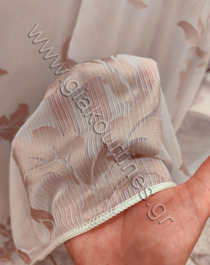 Κουρτίνα σταθερή, με εξαιρετικά νήματα και διαφάνεια, έτοιμη ραμμένη. Εξαιρετικά χυτή, Ευρωπαίκών προτύπων και ποιότητας. Διαθέτει βαρίδι στο τελείωμα. Το χρώμα της κουρτίνας είναι υπόλευκο με φιλ κουπέ μοτίβο στο χρώμα της πούδρας.