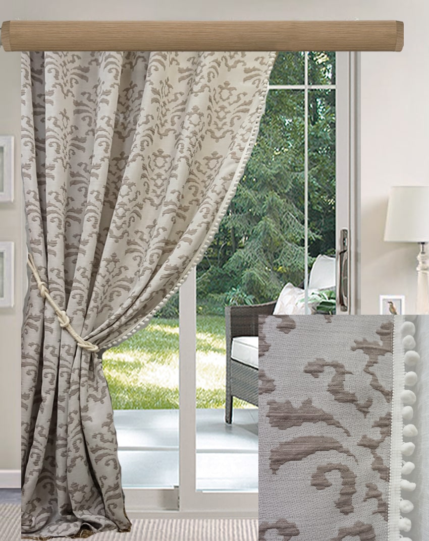 Ριντό αδιάφανο, ,ποιότητα ματ, ανάγλυφο ζακάρ με πομ πομ. Το χρώμα της κουρτίνας είναι ουδέτερο με παστέλ καφέ μπαρόκ μοτίβο.
