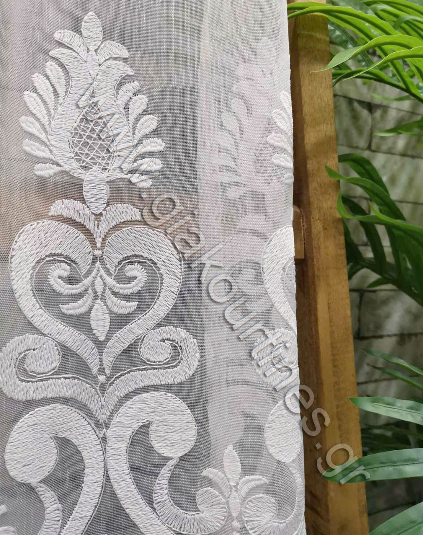 Ύφασμα για κουρτίνα, με το μέτρο, φλάμα, εξαιρετικής ποιότητας, Ευρωπαϊκών προδιαγραφών. Το χρώμα της είναι λευκό με λευκό εντυπωσιακό κέντημα και φιστόνι στο τελείωμα. Το ύψος του μοτίβου είναι 75 εκατοστά . Μπορεί να χρησιμοποιηθεί μόνη της, ως κουρτίνα ή σε συνδυασμό με πιο χοντρή κουρτίνα.