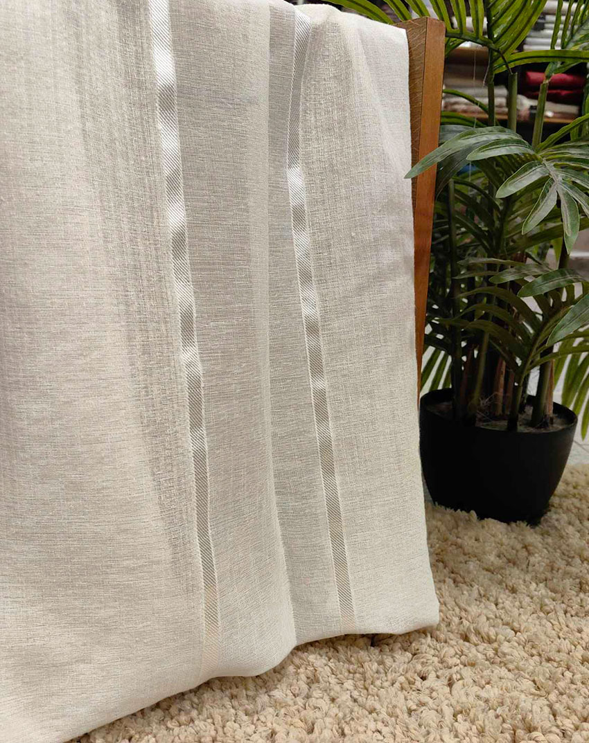 Ύφασμα για κουρτίνα , ημιδιάφανη, Ευρωπαϊκών προδιαγραφών. Γάζα σταθερή, διαθέτει ενσωματωμένο βαρίδι στο τελείωμα για σωστό λούκι και στήσιμο της κουρτίνας. Η κουρτίνα έχει χρώμα σπασμένο λευκό με φλος ρίγες μεσα στην ύφανση