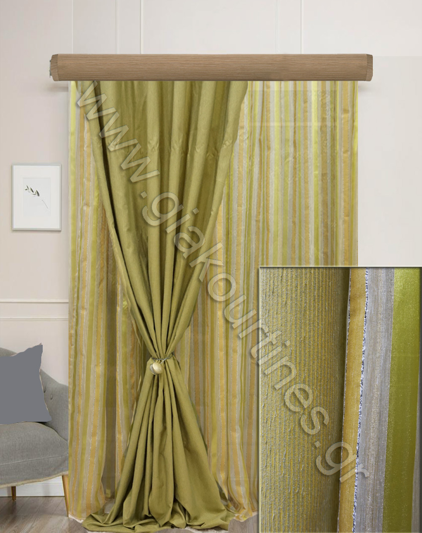 Εσωτερική κουρτίνα με διαφάνεια, με ρίγες σε αποχρώσεις του λαχανί και του χρυσαφί. Διαθέτει βαρίδι στο τελείωμα.