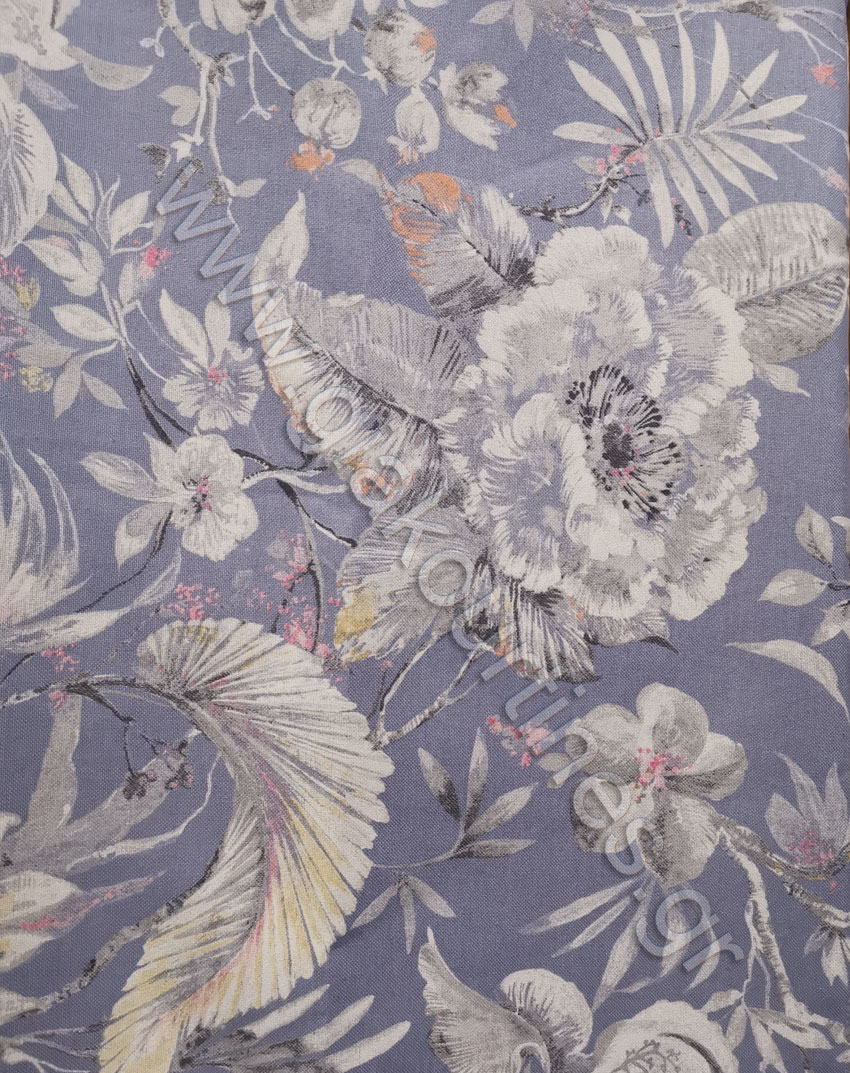 Ύφασμα για κουρτίνα , χωρίς διαφάνεια, λονέτα Ισπανίας άριστης ποιότητας. Tropical μοτίβο με παστέλ μπλε βάση.