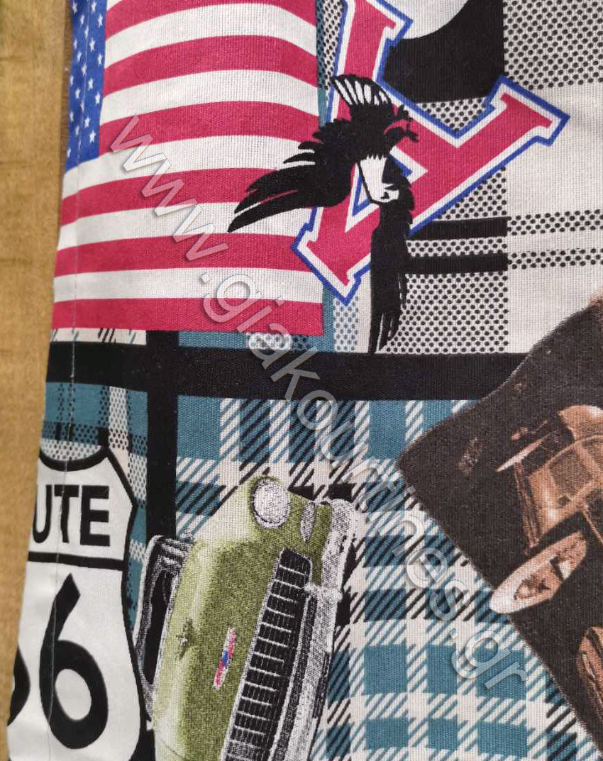 Ύφασμα για κουρτίνα , χωρίς διαφάνεια, λονέτα Ισπανίας άριστης ποιότητας. Μοτίβα USA, ιδανικό για εφηβικό, νεανικό και φοιτητικό δωμάτιο.