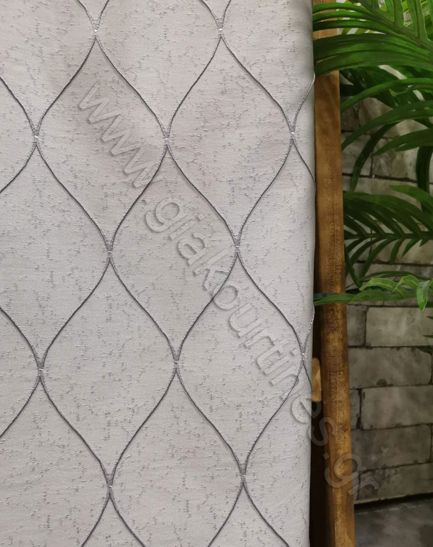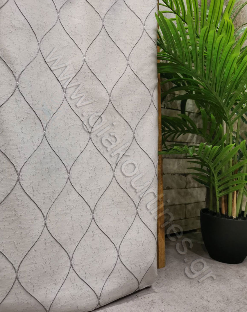Ύφασμα για κουρτίνα, πολυτελείας, χωρίς διαφάνεια, ύφασμα ζακάρ, Ευρωπαϊκών προτύπων. Μονόχρωμη βάση γκρι με ανάγλυφο μοτίβο χρώμα γκρι και φλος λεπτομέρεια στην ένωση των μοτίβων.