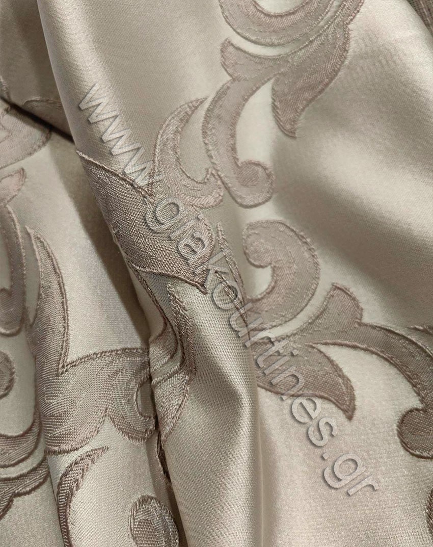 Ύφασμα για κουρτίνα, χωρίς διαφάνεια, ύφασμα ζακάρ ταφτάς ματ, Ευρωπαϊκών προτύπων. Το χρώμα της κουρτίνας είναι ανοιχτό ψυχρό μπεζ με μπαρόκ μοτίβο ψυχρό παστέλ καφέ.