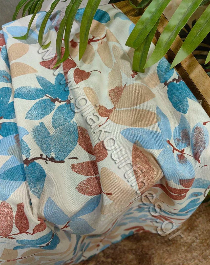 Ύφασμα για κουρτίνα , χωρίς διαφάνεια, λονέτα καραβόπανο Ισπανίας άριστης ποιότητας. Η βάση της κουρτίνας είναι λευκό με φύλλα γαλάζια κανελί και μπεζ.