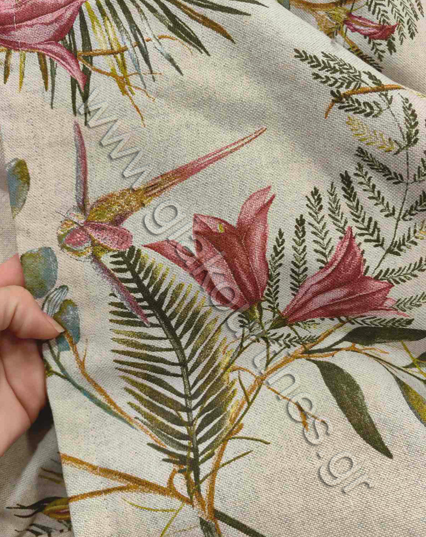 Ύφασμα για κουρτίνα , χωρίς διαφάνεια, λονέτα καραβόπανο Ισπανίας άριστης ποιότητας. Η βάση της κουρτίνας είναι μπεζ σπαγγί με φύλλα και λουλούδια.