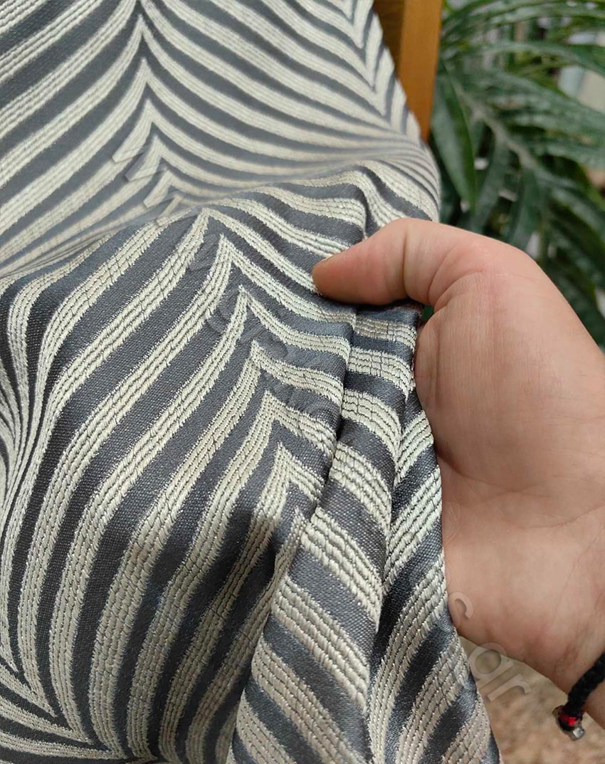 Ύφασμα για κουρτίνα, χωρίς διαφάνεια, ύφασμα ζακάρ ταφτάς ματ, Ευρωπαϊκών προτύπων. Το χρώμα της κουρτίνας είναι γκρι με σχέδιο ψαροκόκκαλο.