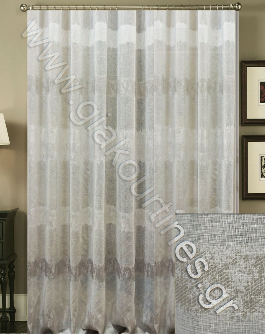 Κουρτίνα τύπου λινό πολυέστερ με ματ υφή, ημιδιάφανη. Μοντέρνο ύφασμα ατσαλάκωτο, με ύφανση οριζόντιες φαρδιές ρίγες. Το χρώμα της κουρτίνας είναι υπόλευκο με ρίγες υπόλευκες και γκρι ανοιχτό.