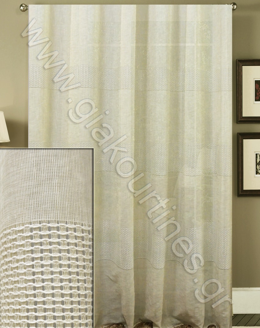 Κουρτίνα ημιδιάφανη, τύπου λινό πολυέστερ με ματ υφή.Εξαιρετική ποιότητα, βαρύ, μοντέρνο ύφασμα, χυτό και μαλακό, δεν χρειαζεται ιδιαίτερο σίδερο. Το χρώμα της κουρτίνας είναι μπεζ ουδέτερο με πολλαπλές ρίγες αζούρ.