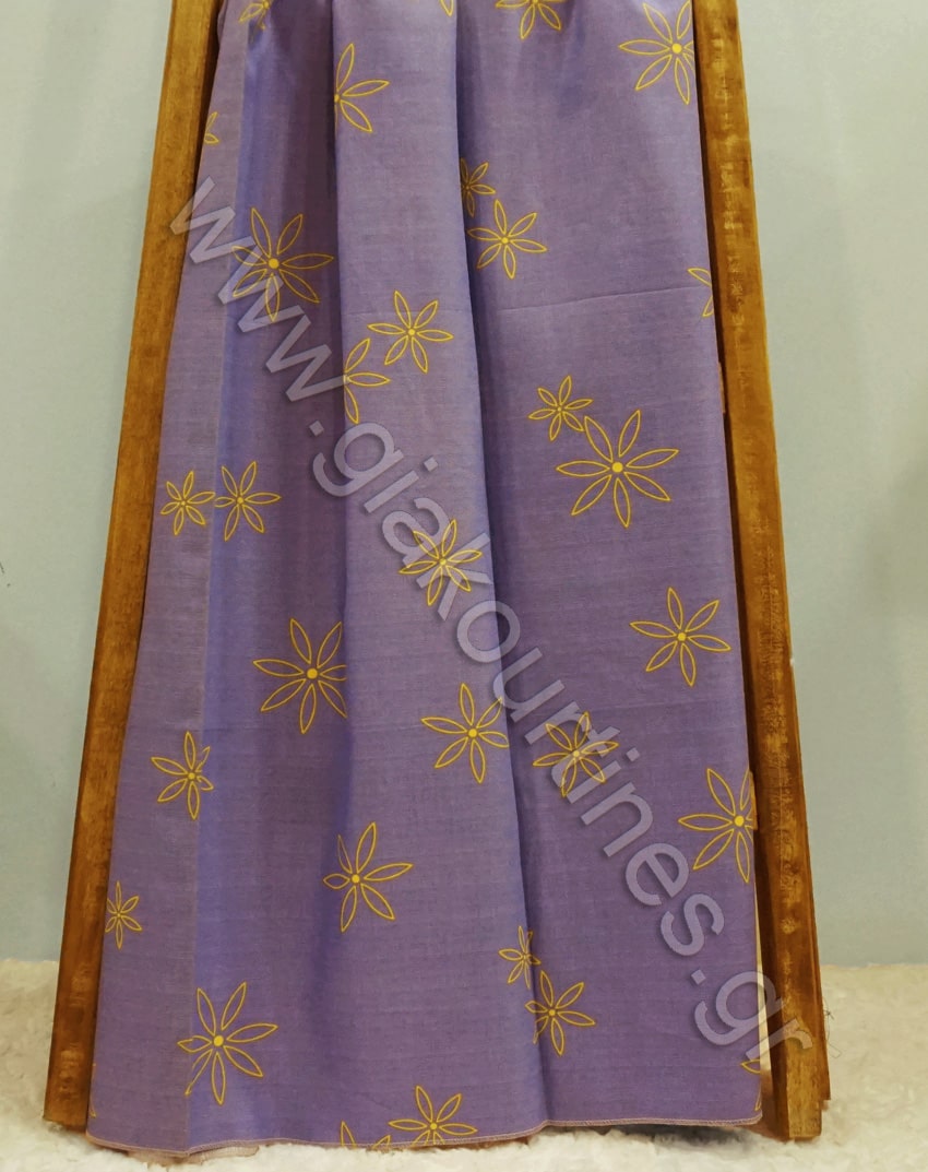 Ύφασμα αδιάφανο, ποιότητα λονέτα. Το χρώμα του είναι ανοιχτό μπλε με λουλούδια κίτρινα.