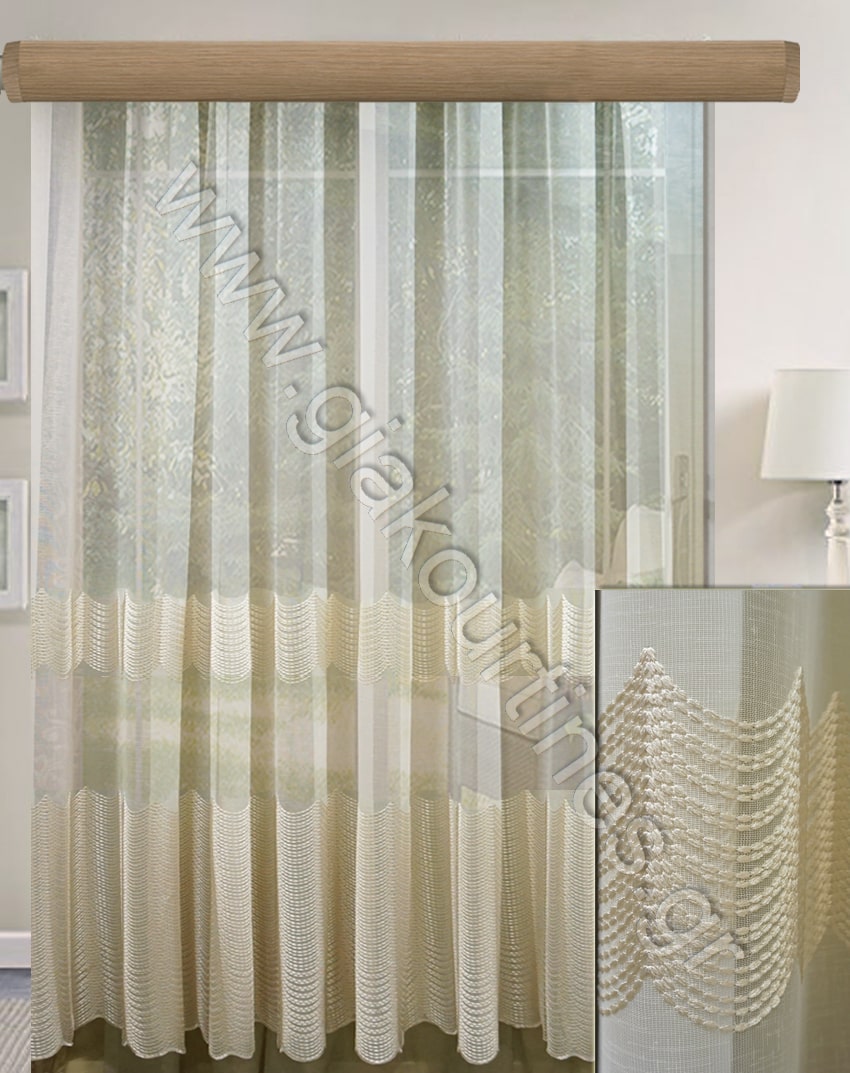 Κουρτίνα διάφανη, ματ τύπου λινό. Είναι χυτό ύφασμα με φιστόνι στο τελείωμα και πυκνοδουλεμένο κέντημα. Το χρώμα της κουρτίνας είναι ιβουάρ με κέντημα εκρού.