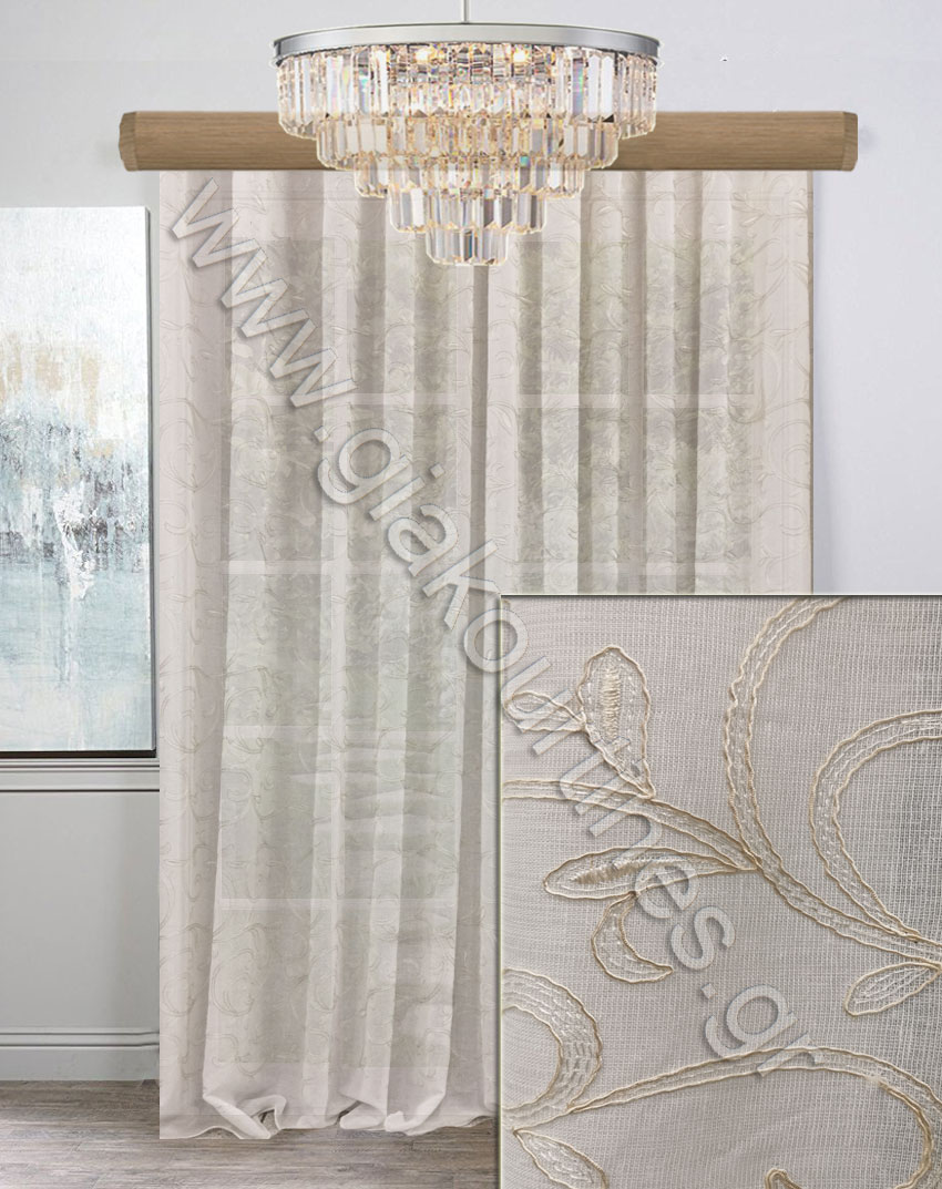 Κουρτίνα πολυτελείας, μερικής διαφάνειας, έτοιμη ραμμένη. Ύφασμα ματ, Ευρωπαίκών προτύπων και ποιότητας. Διαθέτει βαρίδι στο τελείωμα. Το χρώμα της κουρτίνας είναι λευκό με ανάγλυφο κεντημένο σχέδιο, χρώμα ιβουάρ προς εκρού.