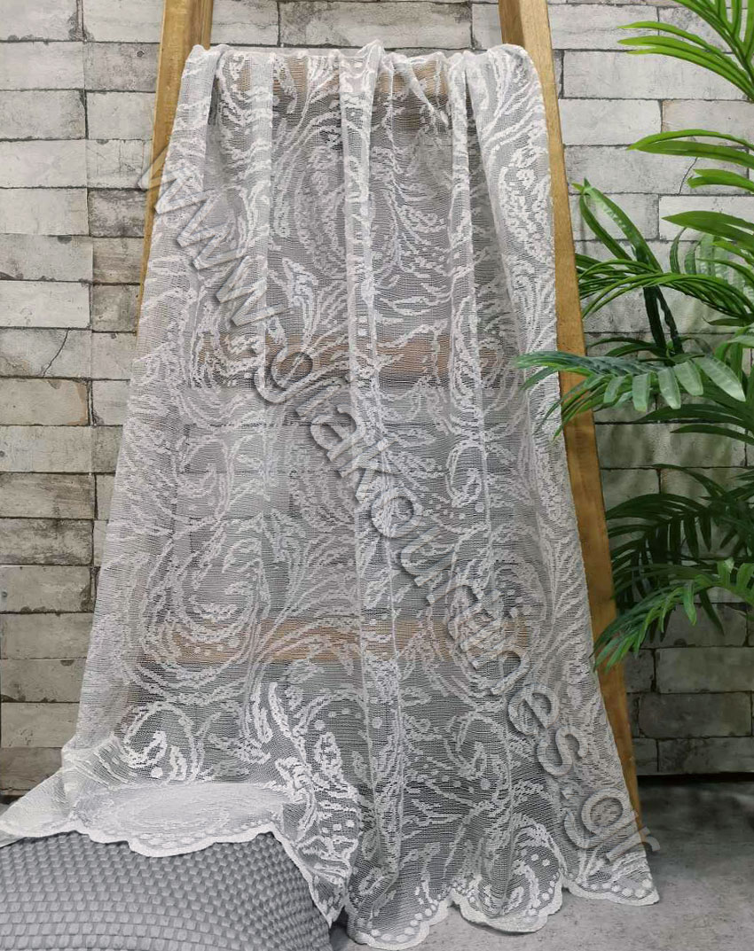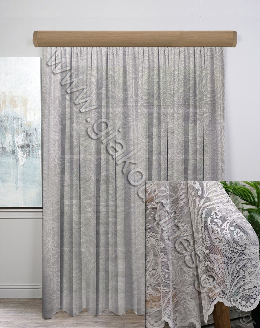 Κουρτίνα σταθερή δαντέλα, με εξαιρετικά νήματα και διαφάνεια, έτοιμη ραμμένη. Εξαιρετικά χυτή, Ευρωπαίκών προτύπων και ποιότητας. Διαθέτει φιστόνι στο τελείωμα με μοντέρνο μοτίβο. Είναι ατσαλάκωτο ύφασμα, χρώμα απαλό γκρι.